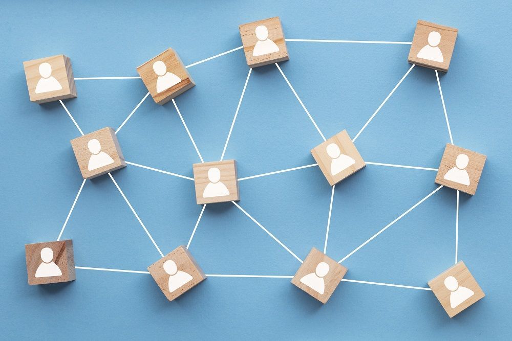 Holzbausteine mit Symbolen von Menschen liegen auf einem blauen Untergrund. Zwischen den Bausteinen wurden Verbindungslinien gezeichnet. Systemisches Arbeiten