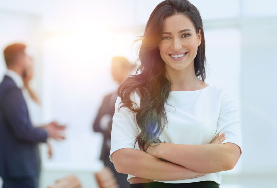 Frau lächelt mir verschränkten Armen zum Betrachter. Im Hintergrund redet eine Gruppe miteinander. ©Adobe Stock