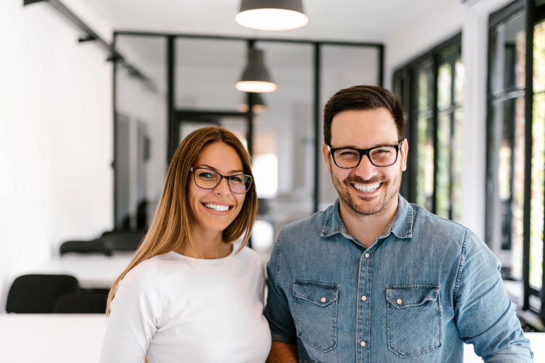 Eine Frau und ein Mann stehen nebeneinander in einem Bürogebäude und lächeln zum Betrachter. ©Adobe Stock