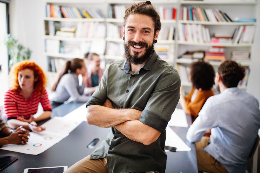 Ein Mann lehnt mit verschränkten Armen lächelnd an einem Tisch, an dem im Hintergrund mehrere Menschen arbeiten und miteinander reden. ©Adobe Stock