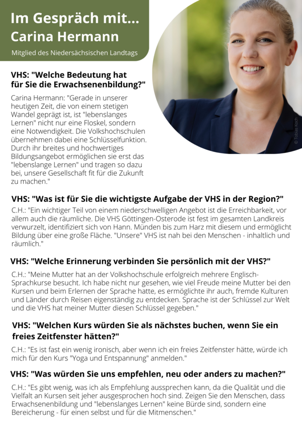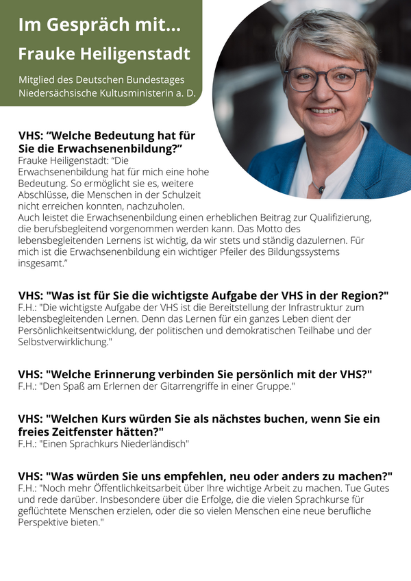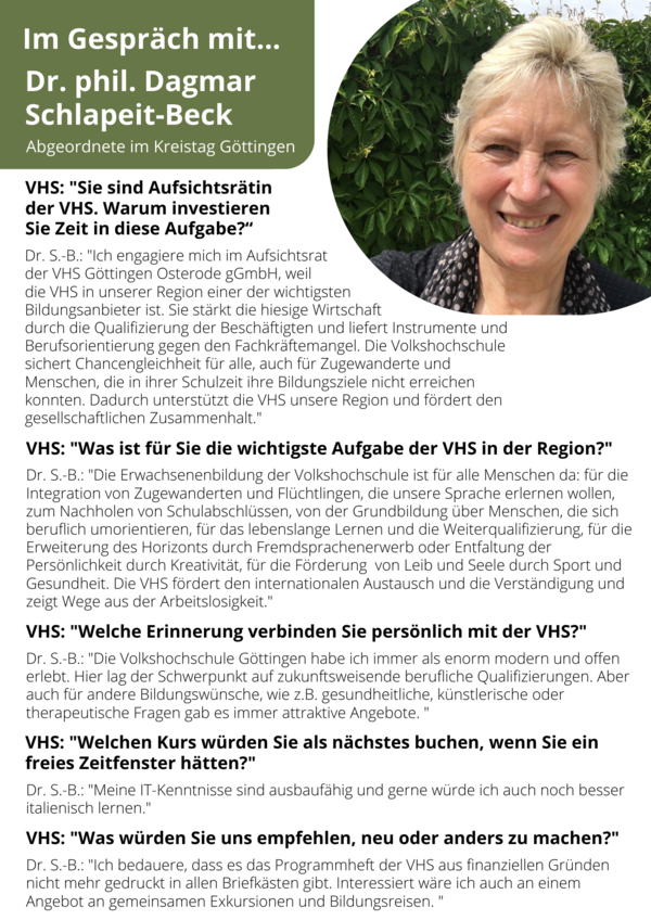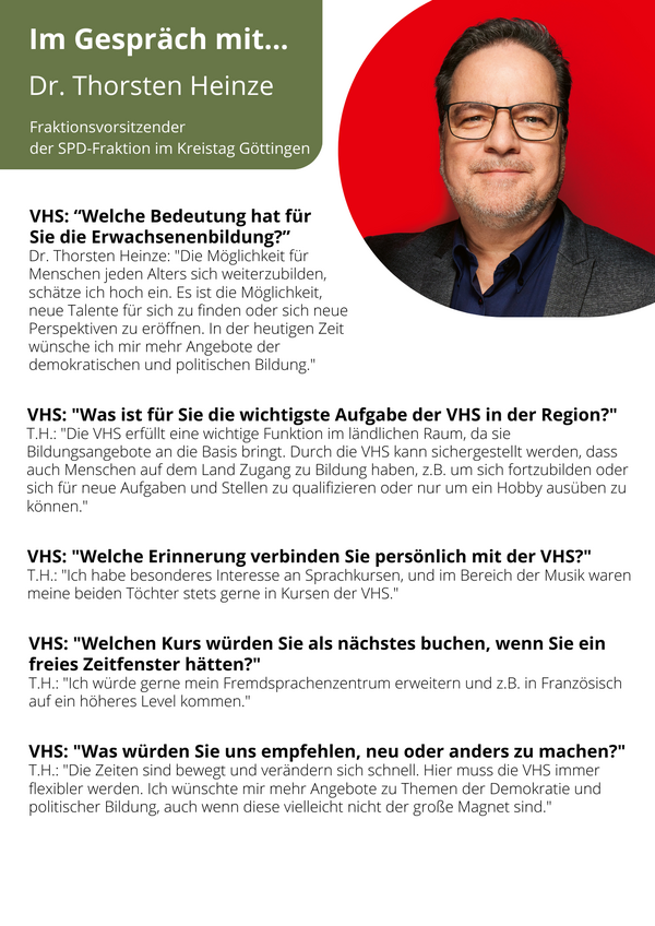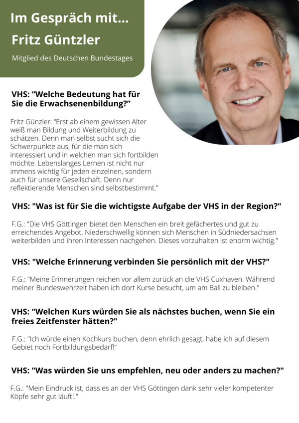 Unter dem Motto „Im Gespräch mit…“ interviewt die VHS Persönlichkeiten aus Stadt und Landkreis Göttingen zu ihrem Verhältnis zum lebenslangen Lernen und unserer Einrichtung. Wenn Sie uns selbst Ihre Meinung mitteilen möchten, sprechen wir auch mit Ihnen.